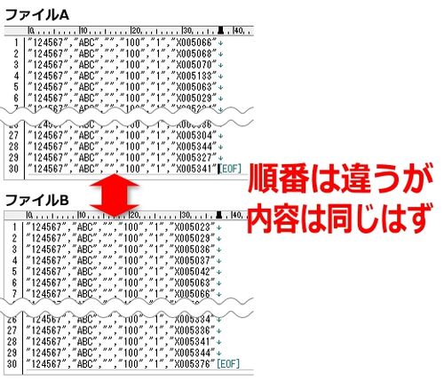 以前とある業務で、引き継ぎ相手に Web送信用のCSVファイルを作らせて、自作ファイルと比較しようと思った時のこと。チェックしようとして気付いたのだが、何故か引き継ぎ相手が作ったファイルは私のものとは行の並びが違っていた。送信するデータの順番自体…