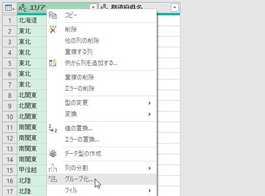 「エリア」列の見出しを右クリックして「グループ化」
