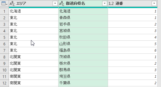 事前に画像のような「エリア」列と「都道府県名」列を持つテーブルを、「テーブル1」として読み込んでいるものとします。