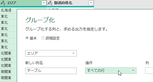 行のグループ化 = Table.Group(テーブル, {"エリア"}, {