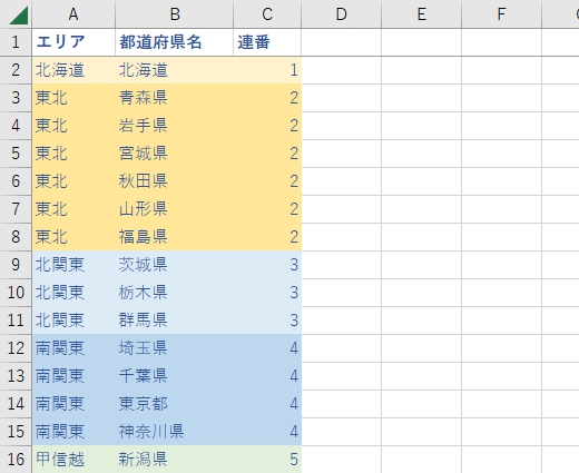 例えば下の画像のように、「エリア」ごとにグループを分けて、「都道府県名」に番号を振りたい場合、どうすればいいでしょうか。