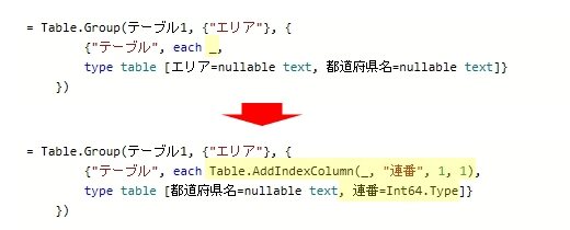 = Table.Group(テーブル1, {"エリア"}, {{"テーブル", each Table.AddIndexColumn(_, "連番", 1, 1), type table [エリア=nullable text, 都道府県名=nullable text, 連番=Int64.Type]}})