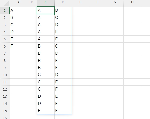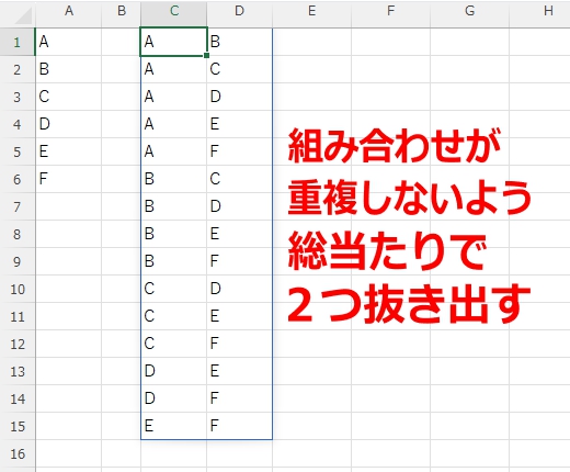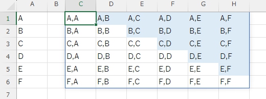 まずは対戦表というか組み合わせリストを作りましょう。ここでは重複は気にしなくていいです。後で分割するための区切り記号として「,」を間に挟んでいます。